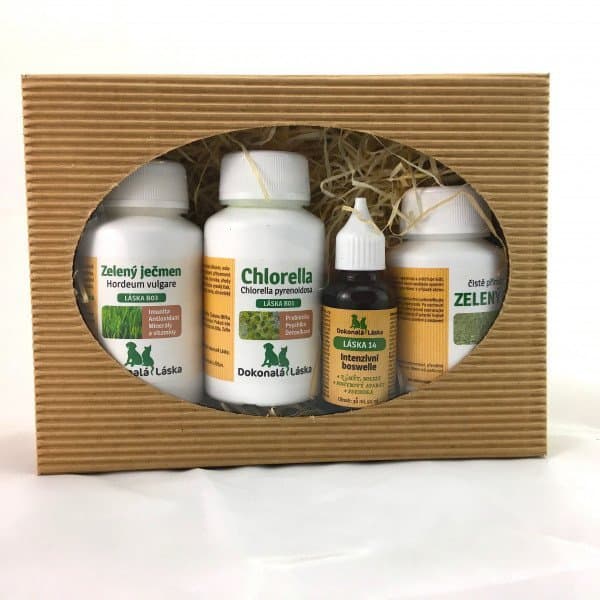 Speciální podpůrný balíček Dokonalé Lásky pro přípravu zvířete na výkon a nápor sportovní a výstavní sezóny . Určeno pro malé a středně velké psy. Přípravnou kúru provozujte 10 dnů. Balíček obsahuje: 50 g LÁSKA B03 Zelený ječmen, 50 g LÁSKA B01 Chlorella, 100 g LÁSKA B04 Zelený jíl, 30 ml LÁSKA 14 Intenzivní Boswellie Balení: Papírová krabička s průhledným víkem.