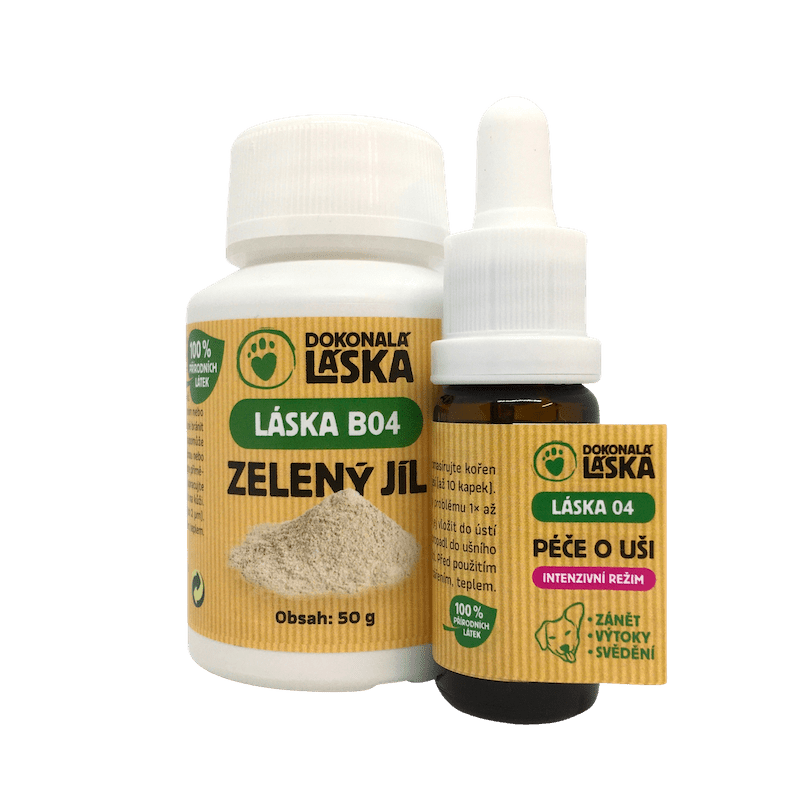 Balíček obsahuje: LÁSKA 04 Péče o uši v intenzivním režimu a LÁSKA B04 Zelený jíl Přípravek LÁSKA 04 Péče o uši v intenzivním režimu napomáhá regulaci počtu bakterií a kvasinek . Olejová báze je pro uši přirozená a uchu vlastní. Účinné látky působí hojivě a dezinfekčně. Svědící ucho si pes často drbe zadní nohou. Toto s sebou přináší riziko přenosu infekce a bakterií. Proto je velice vhodné přípravky aplikovat v případě obtíží také na tlapky do meziprstí . Nadměrně osrstěný zvukovod vyžaduje občasné vytrhání chlupů. LÁSKA B04 Zelený jíl je výbornou pomůckou. Mastné chlupy v uších zdrsní a ty se poté lépe uchopí a po malých chomáčcích vytrhnou. LÁSKA B04 Zelený jíl ucho nevysušuje a zároveň napomáhá dohojení kůže po vytržení. Zelený jíl působí hojivě a detoxikačně. V případech povrchového krvácení napomůže rychlejšímu a zastavení krvácení.
