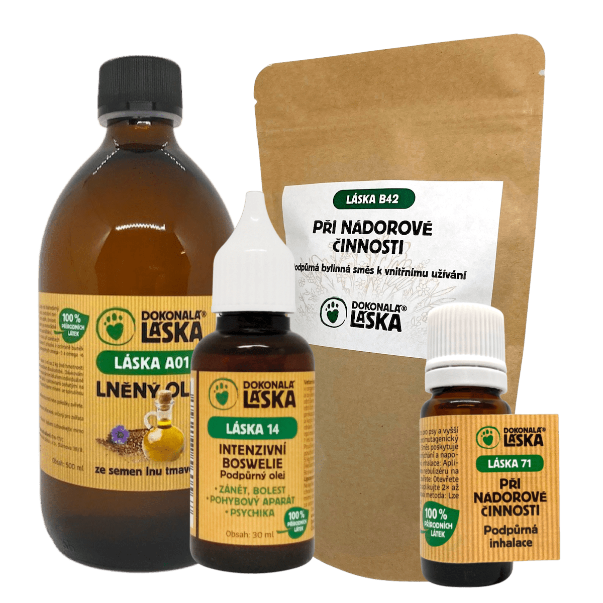 Tento set přípravků je určen pro zvířata s nádorovým onemocněním . Obsahuje přípravky, které mohou zvýšit šance na zpomalení nebo zastavení růstu nádoru a zamezit rozšiřování do organismu. LÁSKA 71 PODPŮRNÁ INHALACE PŘI NÁDOROVÉ ČINNOSTI Obsažené přírodní látky vykazují prokazatelný antiproliferativní, antimutagenický a antioxidační účinek, mohou tedy napomoci zpomalení nádorové činnosti. Směs poskytuje také protizánětlivý účinek a působí úlevně při bolesti. Podporuje normální dýchání a napomáhá pročištění dýchacích cest. LÁSKA B42 BYLINNÁ SMĚS PŘI NÁDOROVÉ ČINNOSTI Směs léčivých bylin a dřevin s antiproliferativním a antioxidačním účinkem. Pro jemné dlouhodobé působení. LÁSKA A01 LNĚNÝ OLEJ Lněná semena a panenský olej z tmavých semen (získaný lisováním za studena) jsou vůbec nejbohatším rostlinným zdrojem mastných kyselin typu omega-3. Len je rovněž nejbohatším zdrojem rostlinných chemikálií s antivirovými, fungicidními, baktericidními a protirakovinnými vlastnostmi, jimž se říká lignany. Pro maximální využití léčebných účinků lněný olej podávejte k vnitřnímu užití podle protokolu Budwigové (návod v popisu oleje ). LÁSKA 14 INTENZIVNÍ BOSWELIE Jedná se o přípravek, který používají zvířata s chronickými problémy s pohybovým aparátem, pro harmonizaci svalových nervů, také při zúžené průdušnici. Ale esenciální oleje a resinoidy ve složení přípravku disponují také protinádorovým působením a jsou velmi intenzivně vědecky zkoumány. Kromě toho se jedná o velmi příjemný harmonizant psychiky a nervové soustavy. DALŠÍ DOPORUČENÉ VYBAVENÍ Nebulizér pro inhalační aplikaci. VZNIK RAKOVINY U ZVÍŘAT Nádorové buňky mají poškozenou DNA. Následně pak vytvářejí jiné bílkoviny než zdravé buňky. Tyto pozměněné bílkoviny se nazývají neoantigeny. Imunitní systém rozpozná a zničí většinu těchto buněk. Avšak u zhoubných nádorů imunitní systém tyto buňky nerozezná a nevyvine proti nim aktivitu. STRES – IMUNITA – RAKOVINA Stres u zvířete je krátkodobý nebo dlouhodobý. Ten krátkodobý (například při zápalu hry, plnění úkolů apod.) bývá prospěšný. Může povzbudit funkci imunitního systému, jako například hojení ran, zvládnutí očkování, tvorbu protiinfekčních látek nebo – protinádorové reakce. Oproti tomu dlouhodobý stres vytváří chronické zánětlivé stavy a snižuje imunitu. Organismus si vytváří rezistenci vůči kortizolu, který se při stresu tvoří a tak dochází ke vzniku a rozvoji zánětlivých procesů. Toto zvyšuje produkci protizánětlivých cytokinů, což podněcuje autoimunitní stavy (například fibromyalgie, revmatoidní artritida a lupus). Kortizol a kostikosteroidy také potlačují tvorbu lymfocytů, což vede ke zvýšenému riziku infekcí a onemocnění. Jakou roli hrají esenciální oleje a léčivé rostliny? Mohou zastávat zásadní roli při zvládání nádorového onemocnění. Některé z nich vykazují významný účinek v působení na buňky: antiproliferativní antimutagenické cytotoxické antioxidační Působí i na imunitní systém a to přímo nebo nepřímo. Nepřímé působení je antibakteriální a antivirové, přímé působení je antistresové a ovlivňující funkce imunocytů. Podporují detoxifikaci a dekontaminaci. Poskytují protizánětlivý účinek, ulevují od bolesti.