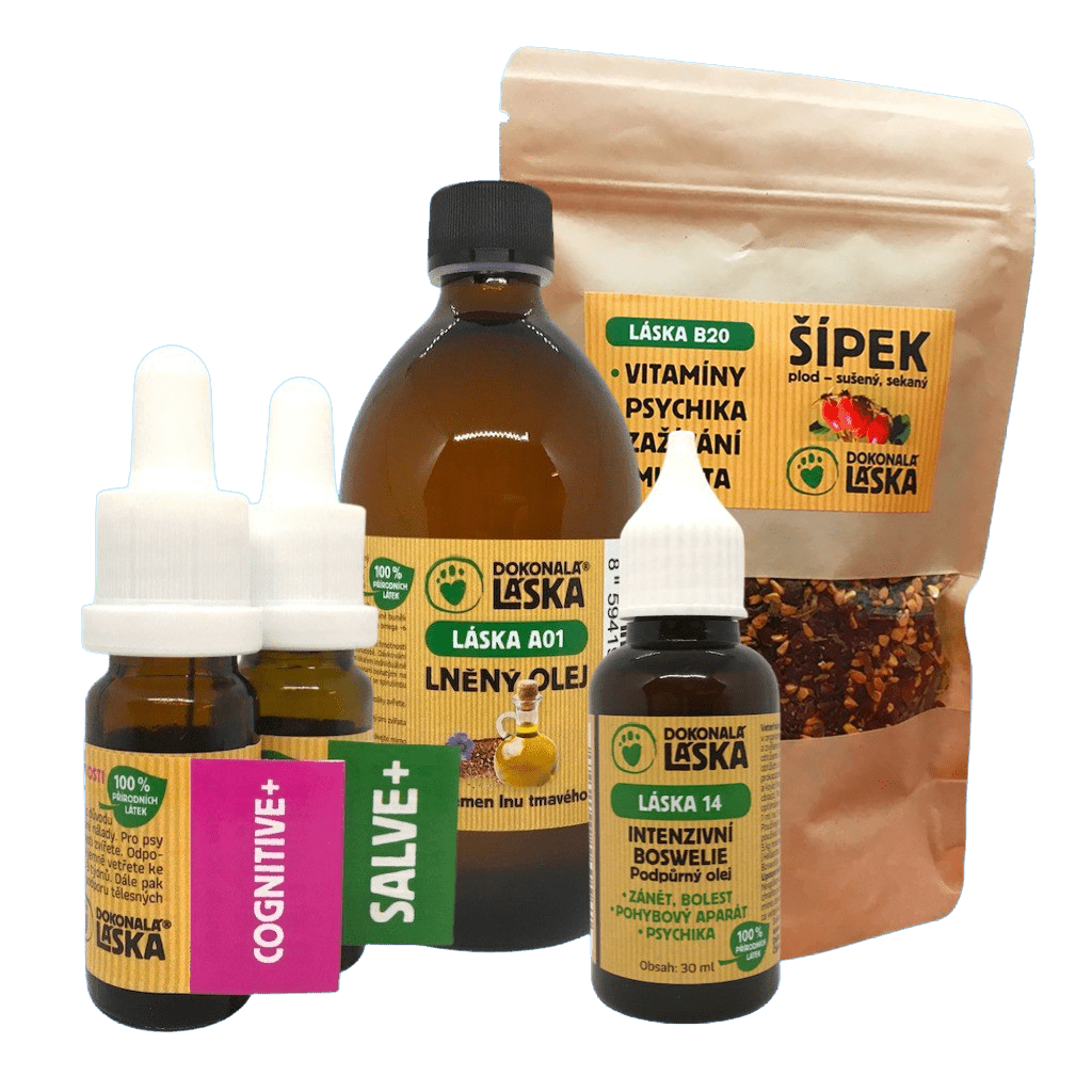 Cognitive+ Pro zlepšení poznávacích funkcí, posílení bystrosti a dobré nálady, zpomalení nástupu demence. Vypoužívejte 1 lahvičku 2 x až 4 x ročně. Lněný olej Skvělý poskytovatel lignanů a antioxidantů v podobě omega 3 a 9 mastných kyselin. Optimálně používejte podle Protokolu Budwigové (návod v popisu přípravku). Salve+ Základní směs pro posílení obranyschopnosti, podporu organismu a tělesných funkcí a pomoc při regeneraci. Podporuje správnou funkci imunitního systému a obranyschopnost organismu. LÁSKA 14 Intenzivní boswelie Boswelie zmírňuje bolestivost a zlepšuje pohyblivost. Uvolňuje ranní ztuhlost a pomáhá při akutních pohybových obtížích. Také pomáhá při dechové nedostatečnosti při zúžené průdušnici. LÁSKA B20 Šípek Jedinečný a pro psy přirozený zdroj vitamínu C, který je zásadní pro správnou funkci organismu i pro psychickou zdatnost. Podávejte podle uvedeného dávkování nebo nabídkou k dobrovolnému příjmu.
