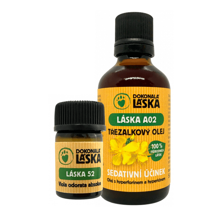 LÁSKA 52: Veterinární přípravek pro zvířata v zájmovém chovu. Extrakt z listu rostliny Viola odorata je speciální látka využívaná nejen v klinické praxi. Přináší nebývalý efekt u psů s psychickými problémy. Ať se jedná o strach nebo utrpení, psovi poskytne okamžitou úlevu a prospěch. Používání extraktu je určeno pouze pro majitele, který je schopen porozumět svému psovi a je schopen rozeznat jeho signály. Tato látka ovlivňuje přenos nervových vzruchů a jako neuromodulátor ovlivňuje náladu, chování, učení, paměť a je popsán i její anxiolyický účinek. Reguluje pocity vzrušení z nových situací a ovlivňuje vnímání bolesti. Reguluje také endokanabioidní systém. Tento široký účinek na psychiku tedy ulevuje v případě: traumatu, posttraumatické stresové poruchy, šokové stavy, problémy se změnou domova, kompulzivní poruchy včetně okusování a olizování z návyku, napětí, stahy, křeče, bolest, srdeční potíže z důvodu stresu, dýchací potíže z důvodu nadměrného vzrušení a hlavně strachu. LÁSKA A02: Olejový macerát určený ke vtírání do srsti a kůže je určen pro psy s projevy posttraumatického stavu nebo při akutním traumatu. Je preferován zvířaty s depresí a při akutním úzkostném stavu. Je vhodný pro epileptiky jako sedativní látka. Ulevuje od bolesti neurologického původu. Olej je fotosenzitivní, proto není vhodné ho aplikovat vetřením před přítomností zvířete na sluníčku nebo v době přímého slunečního záření.