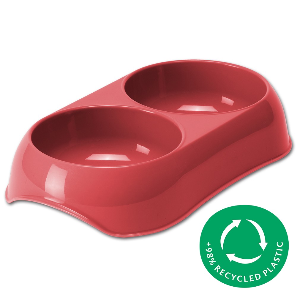 Gusto dvojmiska na vodu nebo granule – pro kočky a malá plemena psů. Je součástí ucelené řady +98% RECYCLED PLASTIC, která sleduje moderní trend výrobků z recyklovaných materiálů.