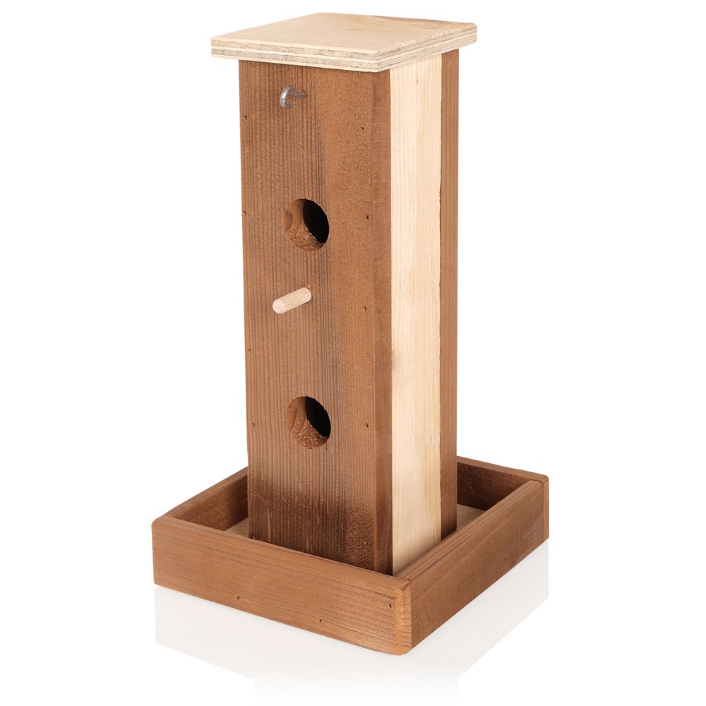 Krmítko ze dřeva určeno pro venkovní využití. Opatřeno vysokou násypkou.