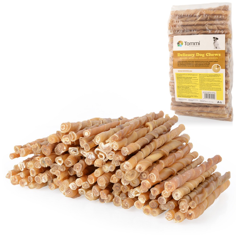 Krmivo – pamlsky pro psy – tyčinka z bůvolí kůže kroucená